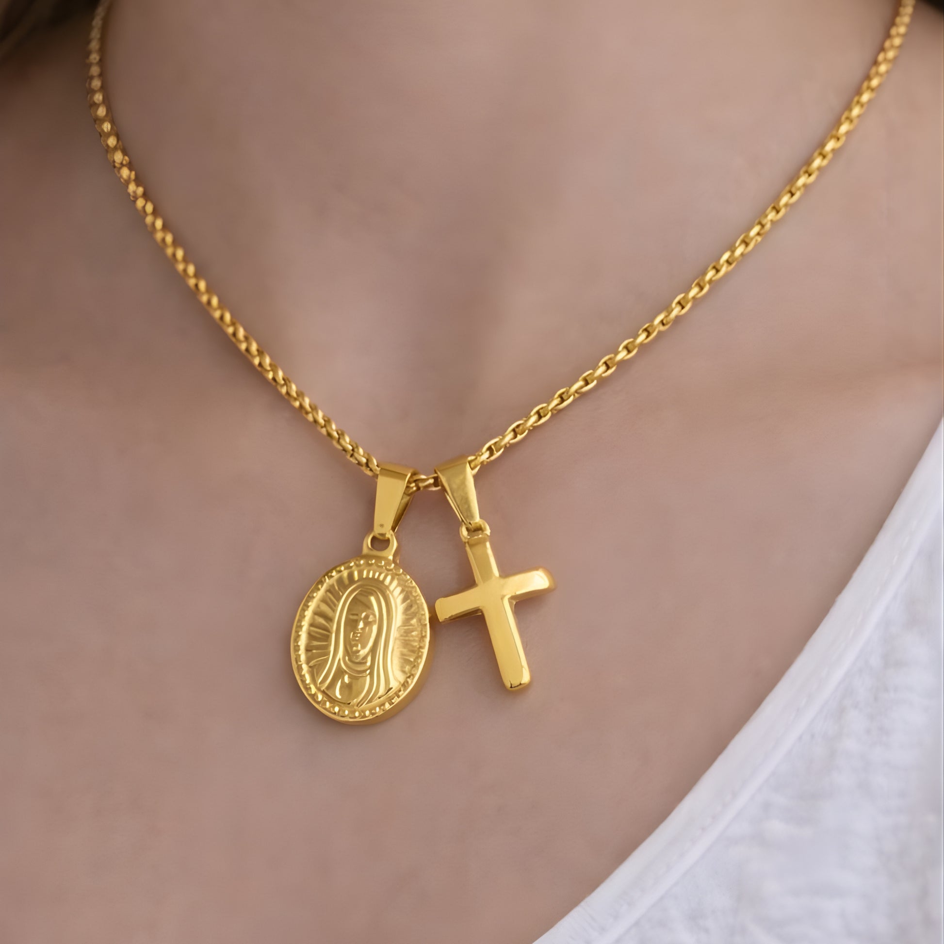Featuring a delicate chain with a classic cross charm paired with a coin-style medallion, this necklace offers a timeless faith-inspired look perfect for daily wear or gifting.
