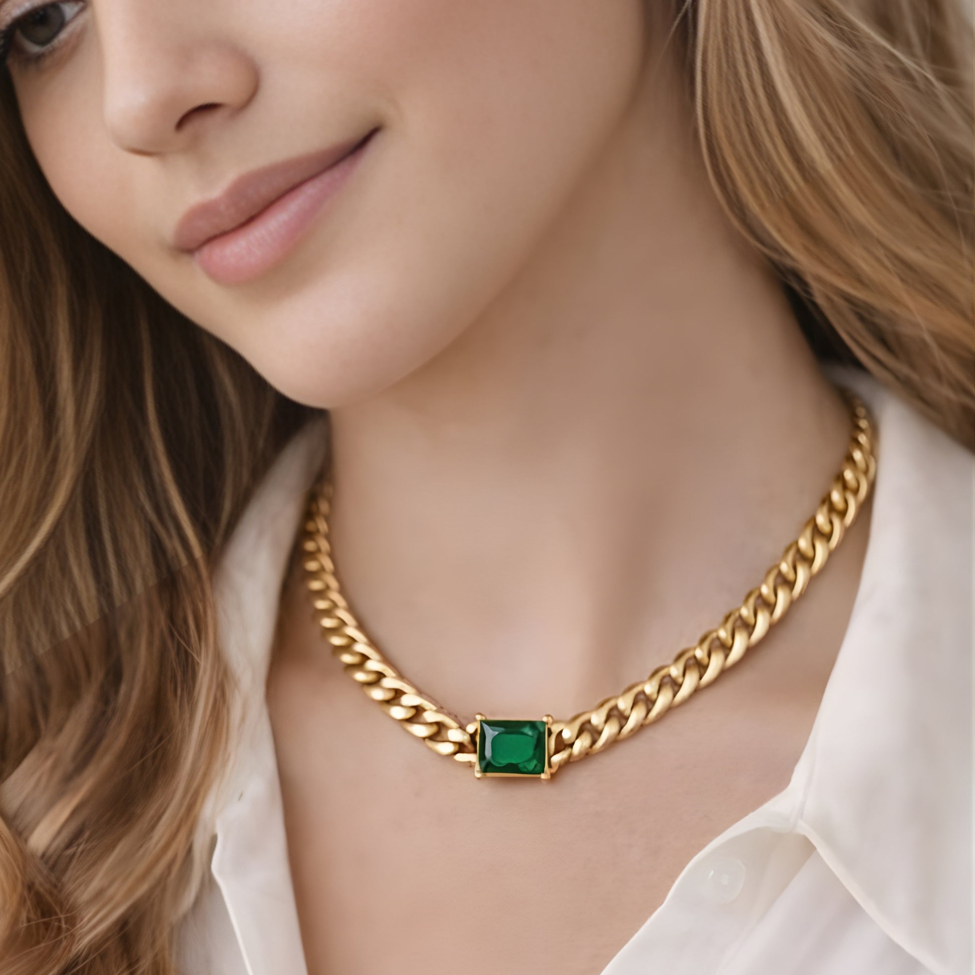 Add bold elegance to your everyday look with this minimalist green stone gold chain jewelry set.
