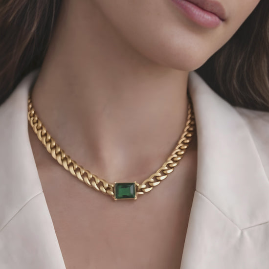 Featuring a chunky gold-color link necklace and matching bracelet with a rich green stone accent, this set is perfect for modern, confident style lovers.